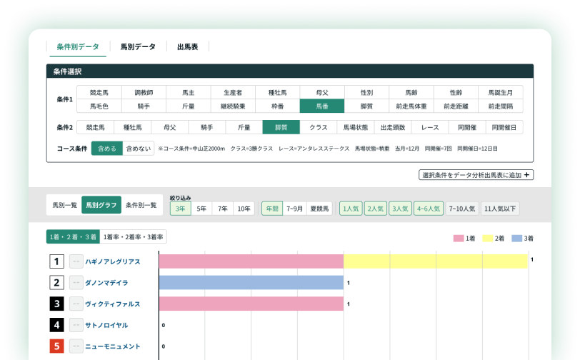 レース一覧、近走成績、データ分析、過去10年など情報量が多いページに条件絞り込み機能を搭載。欲しい情報を見つけ出し、効率よく分析可能に。自分の予想スタイルに合わせてデータを活用し、目指せ的中率アップ!