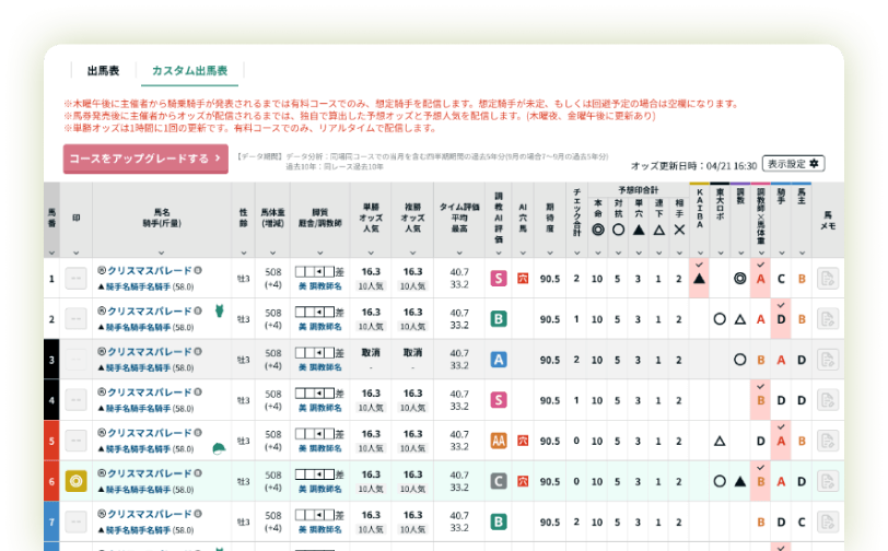 ユーザーそれぞれの「見たい」「知りたい」に応える新機能!通常の出馬表に加え、”この情報を一覧で見たい”、”このデータは不要”といった要望に合わせて、データの表示を自由にカスタマイズ可能な「カスタム出馬表」を搭載。自分だけの見やすい出馬表で、予想をさらに楽しく効率的に。